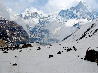Annapurna 8091m is the thirteen highest mountain in the world. Annapurna is a Sanskrit name which literally means “full of food” but is normally translated as Goddess of the Harvests. This mountain section is a 55 km-long massif bounded by the Kali Gandaki Gorge on the west, the Marshyangdi River on the north and east, and Pokhara Valley on the south. The four summits with the entire massif of Annapurna form the northern barrier of Pokhara Valley. The main summit stands to the west of the Annapurna Sanctuary.